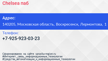 Chelsea, паб по адресу 140205, Московская область, Воскресенск, Лермонтова, 1 в дальнейшем Организация, размещена в следующих категориях: