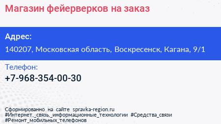 Магазин фейерверков на заказ по адресу 140207, Московская область, Воскресенск, Кагана, 9/1 в дальнейшем Организация, размещена в следующих категориях: