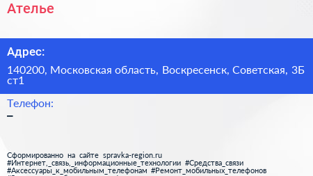 Ателье по адресу 140200, Московская область, Воскресенск, Советская, 3Б ст1 в дальнейшем Организация, размещена в следующих категориях:
