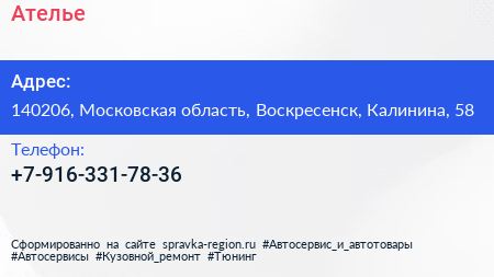 Ателье по адресу 140206, Московская область, Воскресенск, Калинина, 58 в дальнейшем Организация, размещена в следующих категориях: