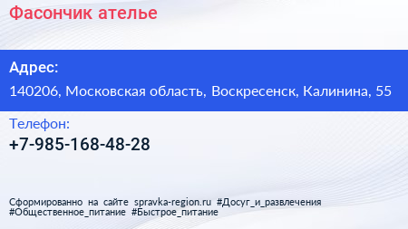 Фасончик, ателье по адресу 140206, Московская область, Воскресенск, Калинина, 55 в дальнейшем Организация, размещена в следующих категориях: