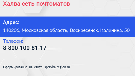 Халва, сеть почтоматов по адресу 140206, Московская область, Воскресенск, Калинина, 50 в дальнейшем Организация, размещена в следующих категориях: