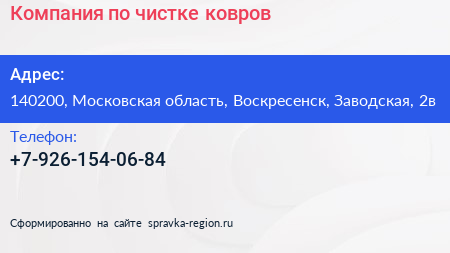 Компания по чистке ковров по адресу 140200, Московская область, Воскресенск, Заводская, 2в в дальнейшем Организация, размещена в следующих категориях: