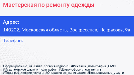 Мастерская по ремонту одежды по адресу 140202, Московская область, Воскресенск, Некрасова, 9а в дальнейшем Организация, размещена в следующих категориях: