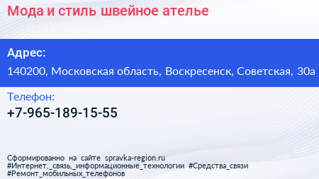 Мода и стиль, швейное ателье по адресу 140200, Московская область, Воскресенск, Советская, 30а в дальнейшем Организация, размещена в следующих категориях: