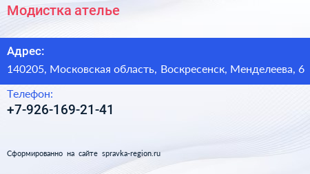 Модистка, ателье по адресу 140205, Московская область, Воскресенск, Менделеева, 6 в дальнейшем Организация, размещена в следующих категориях: