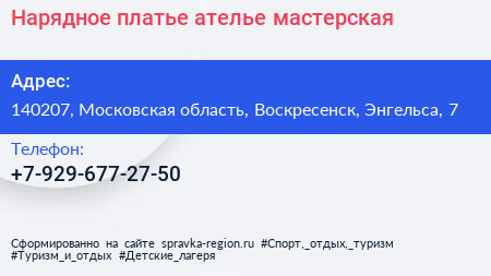 Нарядное платье, ателье-мастерская по адресу 140207, Московская область, Воскресенск, Энгельса, 7 в дальнейшем Организация, размещена в следующих категориях: