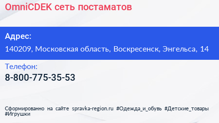 OmniCDEK, сеть постаматов по адресу 140209, Московская область, Воскресенск, Энгельса, 14 в дальнейшем Организация, размещена в следующих категориях: