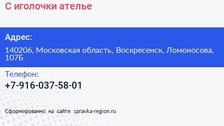 С иголочки, ателье по адресу 140206, Московская область, Воскресенск, Ломоносова, 107Б в дальнейшем Организация, размещена в следующих категориях:
