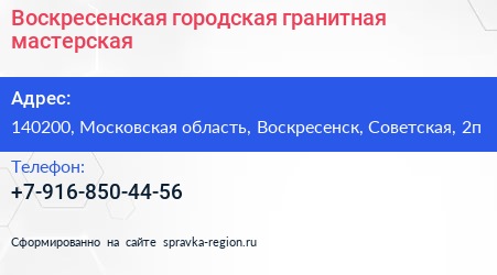 Воскресенская городская гранитная мастерская по адресу 140200, Московская область, Воскресенск, Советская, 2п в дальнейшем Организация, размещена в следующих категориях: