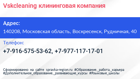 Vskcleaning, клининговая компания по адресу 140208, Московская область, Воскресенск, Рудничная, 40 в дальнейшем Организация, размещена в следующих категориях: