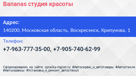 Bananas, студия красоты по адресу 140200, Московская область, Воскресенск, Хрипунова, 1 в дальнейшем Организация, размещена в следующих категориях: