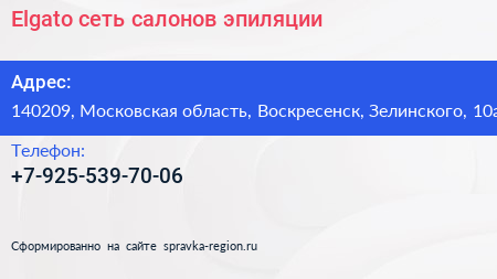 Elgato, сеть салонов эпиляции по адресу 140209, Московская область, Воскресенск, Зелинского, 10а в дальнейшем Организация, размещена в следующих категориях: