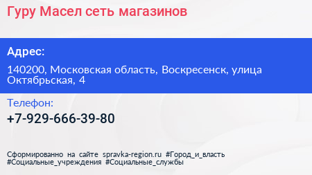 Гуру Масел, сеть магазинов по адресу 140200, Московская область, Воскресенск, улица Октябрьская, 4 в дальнейшем Организация, размещена в следующих категориях: