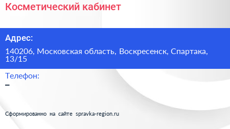 Косметический кабинет по адресу 140206, Московская область, Воскресенск, Спартака, 13/15 в дальнейшем Организация, размещена в следующих категориях: