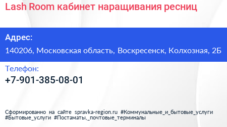 Lash Room, кабинет наращивания ресниц по адресу 140206, Московская область, Воскресенск, Колхозная, 2Б в дальнейшем Организация, размещена в следующих категориях: