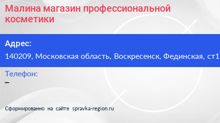 Малина, магазин профессиональной косметики по адресу 140209, Московская область, Воскресенск, Фединская, ст1 в дальнейшем Организация, размещена в следующих категориях: