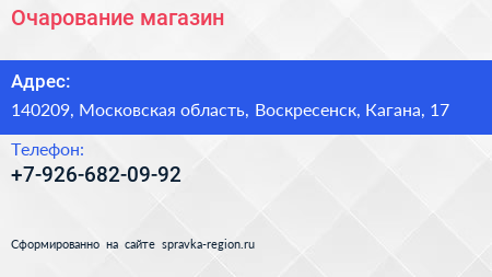 Очарование, магазин по адресу 140209, Московская область, Воскресенск, Кагана, 17 в дальнейшем Организация, размещена в следующих категориях: