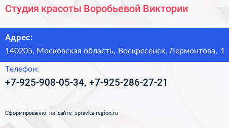 Студия красоты Воробьевой Виктории по адресу 140205, Московская область, Воскресенск, Лермонтова, 1 в дальнейшем Организация, размещена в следующих категориях: