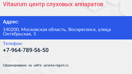 Vitaurum, центр слуховых аппаратов по адресу 140200, Московская область, Воскресенск, улица Октябрьская, 5 в дальнейшем Организация, размещена в следующих категориях: