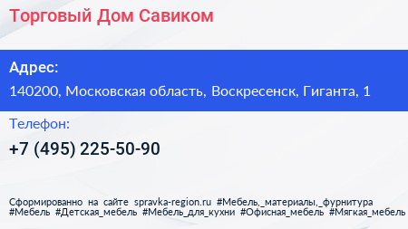 Торговый Дом Савиком по адресу 140200, Московская область, Воскресенск, Гиганта, 1 в дальнейшем Организация, размещена в следующих категориях: