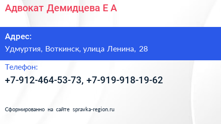 Адвокат Демидцева Е.А. по адресу Удмуртия, Воткинск, улица Ленина, 28 в дальнейшем Организация, размещена в следующих категориях: