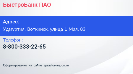 БыстроБанк, ПАО по адресу Удмуртия, Воткинск, улица 1 Мая, 83 в дальнейшем Организация, размещена в следующих категориях: