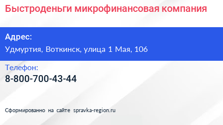 Быстроденьги, микрофинансовая компания по адресу Удмуртия, Воткинск, улица 1 Мая, 106 в дальнейшем Организация, размещена в следующих категориях:
