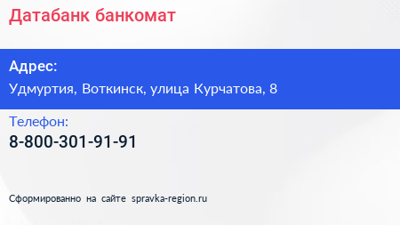 Датабанк, банкомат по адресу Удмуртия, Воткинск, улица Курчатова, 8 в дальнейшем Организация, размещена в следующих категориях: