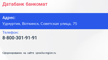 Датабанк, банкомат по адресу Удмуртия, Воткинск, Советская улица, 75 в дальнейшем Организация, размещена в следующих категориях: