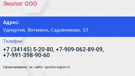 Эколог, ООО по адресу Удмуртия, Воткинск, Садовникова, 13 в дальнейшем Организация, размещена в следующих категориях: