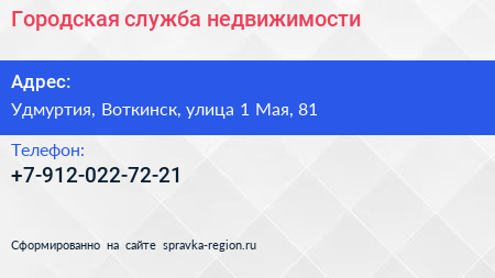 Городская служба недвижимости по адресу Удмуртия, Воткинск, улица 1 Мая, 81 в дальнейшем Организация, размещена в следующих категориях: