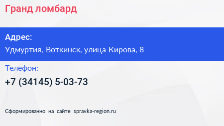 Гранд, ломбард по адресу Удмуртия, Воткинск, улица Кирова, 8 в дальнейшем Организация, размещена в следующих категориях: