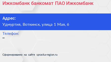 Ижкомбанк, банкомат, ПАО Ижкомбанк по адресу Удмуртия, Воткинск, улица 1 Мая, 6 в дальнейшем Организация, размещена в следующих категориях: