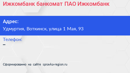 Ижкомбанк, банкомат, ПАО Ижкомбанк по адресу Удмуртия, Воткинск, улица 1 Мая, 93 в дальнейшем Организация, размещена в следующих категориях: