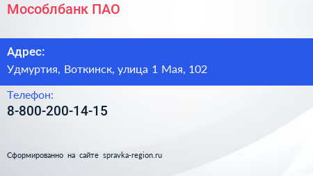 Мособлбанк, ПАО по адресу Удмуртия, Воткинск, улица 1 Мая, 102 в дальнейшем Организация, размещена в следующих категориях: