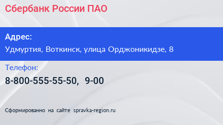 Сбербанк России, ПАО по адресу Удмуртия, Воткинск, улица Орджоникидзе, 8 в дальнейшем Организация, размещена в следующих категориях: