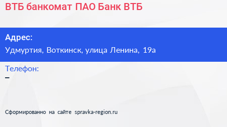 ВТБ, банкомат, ПАО Банк ВТБ по адресу Удмуртия, Воткинск, улица Ленина, 19а в дальнейшем Организация, размещена в следующих категориях: