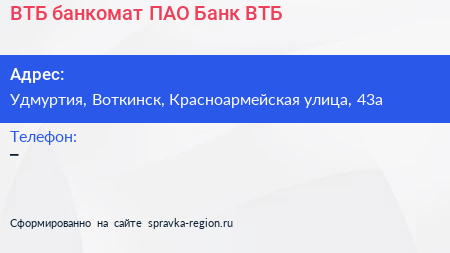 ВТБ, банкомат, ПАО Банк ВТБ по адресу Удмуртия, Воткинск, Красноармейская улица, 43а в дальнейшем Организация, размещена в следующих категориях: