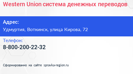 Western Union, система денежных переводов по адресу Удмуртия, Воткинск, улица Кирова, 72 в дальнейшем Организация, размещена в следующих категориях: