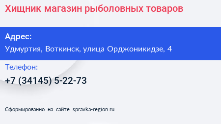 Хищник, магазин рыболовных товаров по адресу Удмуртия, Воткинск, улица Орджоникидзе, 4 в дальнейшем Организация, размещена в следующих категориях: