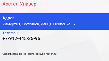 Хостел Универ по адресу Удмуртия, Воткинск, улица Осипенко, 5 в дальнейшем Организация, размещена в следующих категориях: