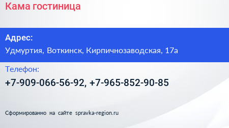 Кама, гостиница по адресу Удмуртия, Воткинск, Кирпичнозаводская, 17а в дальнейшем Организация, размещена в следующих категориях: