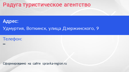 Радуга, туристическое агентство по адресу Удмуртия, Воткинск, улица Дзержинского, 9 в дальнейшем Организация, размещена в следующих категориях: