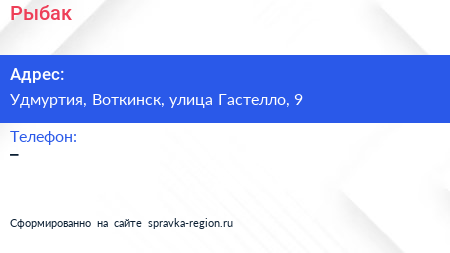 Рыбак по адресу Удмуртия, Воткинск, улица Гастелло, 9 в дальнейшем Организация, размещена в следующих категориях: