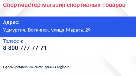 Спортмастер, магазин спортивных товаров по адресу Удмуртия, Воткинск, улица Марата, 29 в дальнейшем Организация, размещена в следующих категориях: