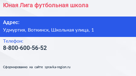 Юная Лига, футбольная школа по адресу Удмуртия, Воткинск, Школьная улица, 1 в дальнейшем Организация, размещена в следующих категориях: