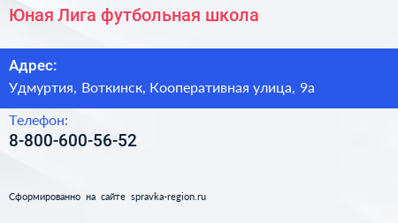 Юная Лига, футбольная школа по адресу Удмуртия, Воткинск, Кооперативная улица, 9а в дальнейшем Организация, размещена в следующих категориях: