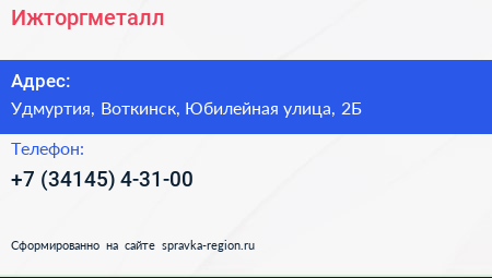 Ижторгметалл по адресу Удмуртия, Воткинск, Юбилейная улица, 2Б в дальнейшем Организация, размещена в следующих категориях:
