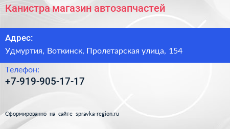 Канистра, магазин автозапчастей по адресу Удмуртия, Воткинск, Пролетарская улица, 154 в дальнейшем Организация, размещена в следующих категориях: